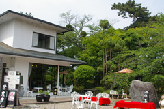 いらっしゃいませ。喫茶室は応接間を使用しております。この部屋は、一面ガラス張りになっており四季の花々が又小鳥たちが飛び交う姿を楽しんでいただけます。商品もいろいろコーヒー、ティー、又抹茶を利用した数多くの品を揃えております。お庭はテーブル席、赤毛氈席と和風洋風と楽しんでいただけます。東の一部はソフトクリーム販売席となっております。部屋の中では小物を販売し見る楽しみもあるお店となっております。