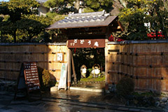 平等院通りに面して古い格子戸を開けて庭にはいると、店の人がいなければドラをたたいて、呼び出すというのもお面白い。築120年の茅葺屋根のお茶室で本場宇治のお抹茶がいただけます。 庭には緋毛氈の敷いた床机がいくつか置いて朱色の野点傘の下でも、お茶を飲みながら、ゆっくりしていただけます。野点傘の下で、茅葺きの茶室をバックに記念写真を写されるお客様も多いです。 |